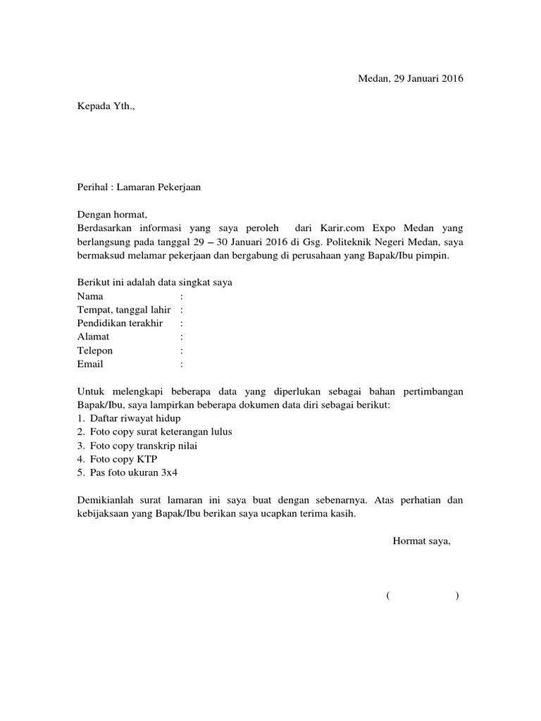 Sebelum kita lanjut ke contoh surat lamaran, ada baiknya kamu membaca kriteria dan tips untuk membuat surat lamaran kerja yang baik dan benar. Contoh surat lamaran kerja job fair. Apa harus mempunyai surat keterangan sehat 40 lembar atau. Lagi ada job fair yang dibuka dilingkungan tempat tinggalmu? Berikut ini biodata singkat saya sehubungan dengan adanya informasi lowongan kerja yang saya dapatkan melalui job fair yang diadakan universitas negeri makassar.