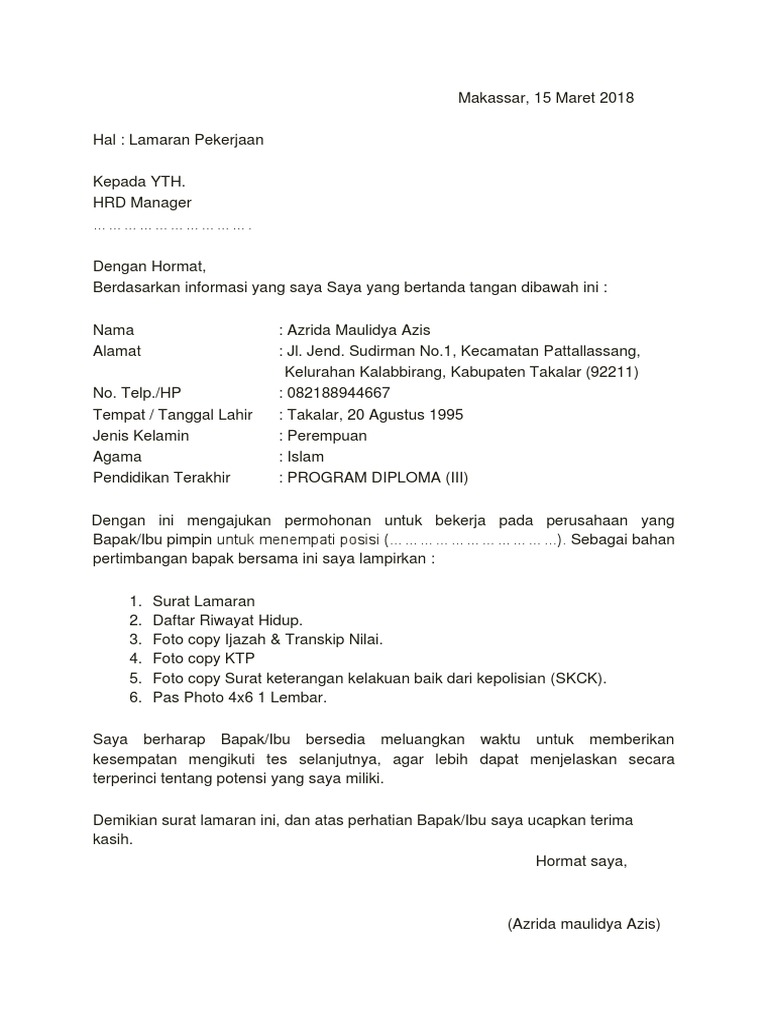 Pada intinya adalah dalam surat lamaran tidak perlu di cantumkan informasi perusahaan tujuan dan posisi yang di lamar. Mengenai data diri saya, dapat saya jelaskan secara singkat. Sebelum kita lanjut ke contoh surat lamaran, ada baiknya kamu membaca kriteria dan tips untuk membuat surat lamaran kerja yang baik dan benar. Bagaimanapun juga apakah kamu layak diterima di sebuah perushaan apa tidak juga bergantung pada resume yang kamu kirimkan. Dengan contoh surat lamaran kerja yang tepat akan memudah kamu dalam membuatnnya.